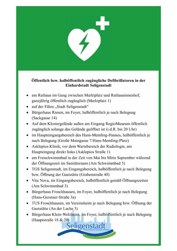 Hier finden Sie eine Liste von öffentlich zugänglichen Defibrilatoren in Seligenstadt. Jede und jeder kann Leben retten!