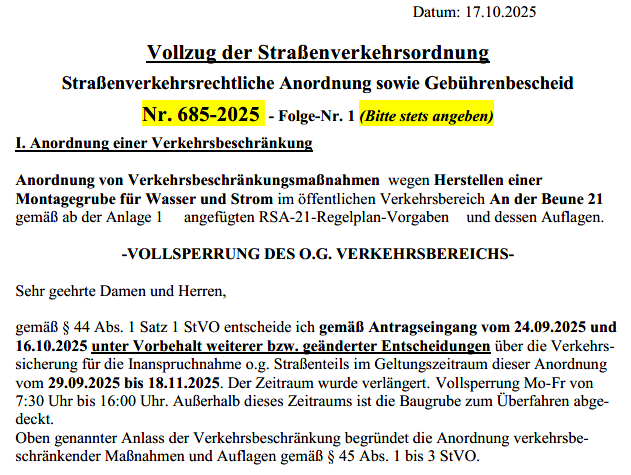 Verkehrsbeschränkung An der Beune - Vollsperrung