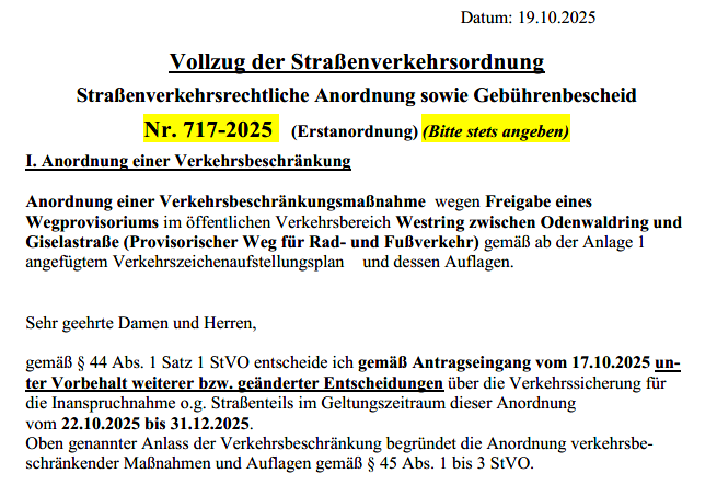 Verkehrsbeschränkung Westring zwischen Odenwaldweg und Giselastraße - Wegprovisorium