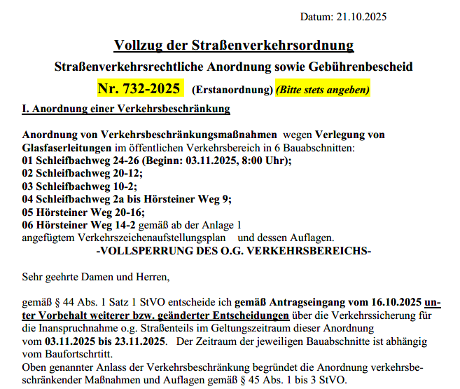 Verkehrsbeschränkung Hörsteiner Weg und Schleifbachweg- Vollsperrung