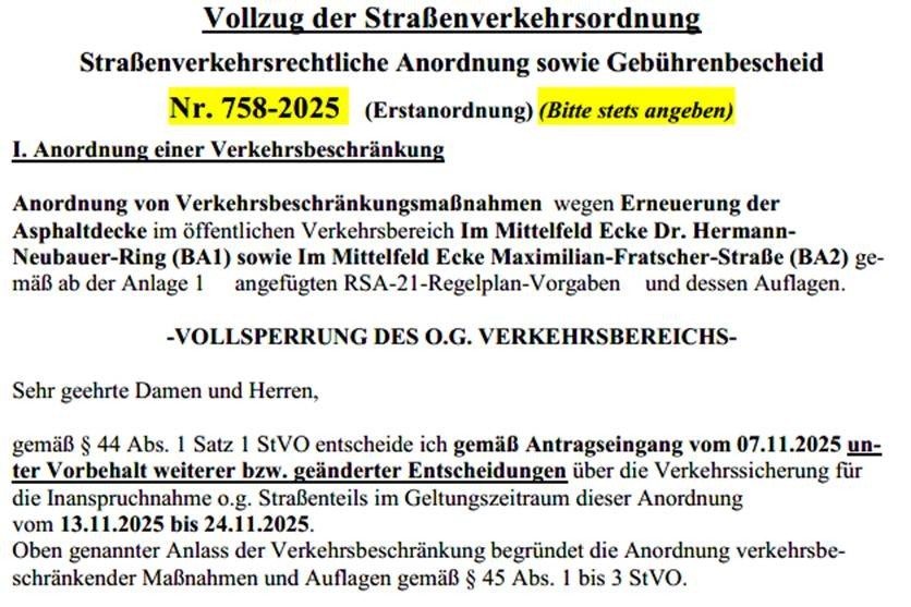 Verkehrsbeschränkung Im Mittelfeld Ecke Dr.-Hermann-Neubauer-Ring sowie Ecke Maximilian-Fratscher-Straße