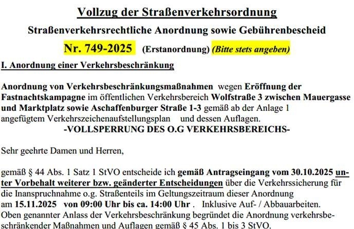 Verkehrsbeschränkung Wolfstraße 3 sowie Aschaffenburger Straße 1-3