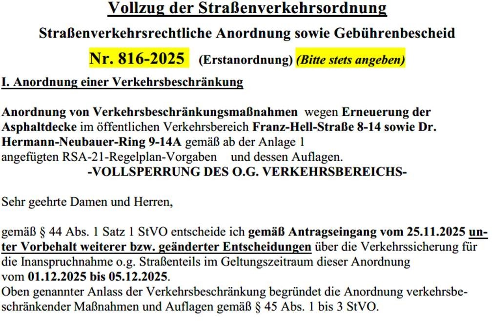 Verkehrsbeschränkung Franz-Hell-Straße sowie Dr. Hermann-Neubauer-Ring