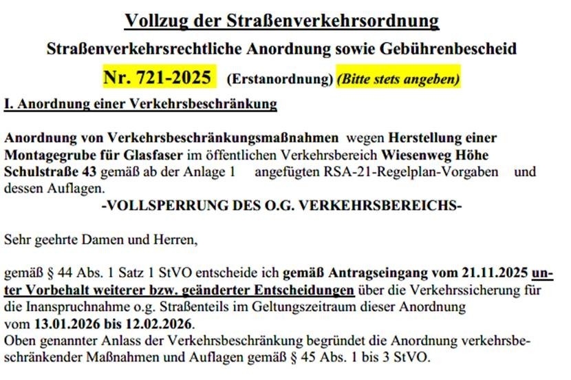 Verkehrsbeschränkung Wiesenweg Höhe Schulstraße 43
