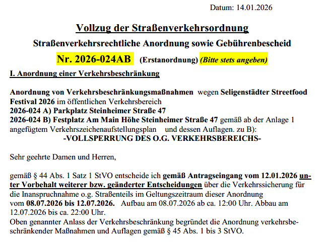 Verkehrsbeschränkung Street Food Festival - Parkplatz Steinheimer Straße und Festplatz