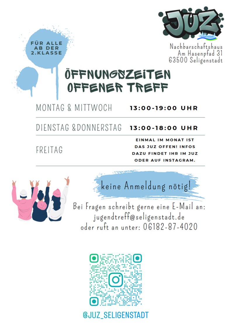 Darüber hinaus veranstalten wir auch immer wieder Projekte, Workshops oder kleinere AGs zu unterschiedlichen Themen. Dabei sind wir immer auf eure Ideen angewiesen, daher schreib uns auch gerne oder ruf direkt an! Unser aktuelles Monatsprogramm mit allen Öffnungszeiten, Projekten und Co. Findest du auf Instagram unter @JuZ_Seligenstadt und hier: